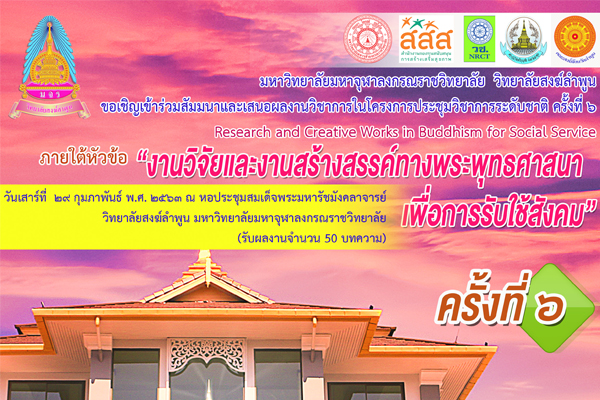 โครงการประชุมวิชาการที่มีรายงานสืบเนื่องจากการประชุม(Proceeding) ครั้งที่ 6 ภายใต้หัวข้อ “งานวิจัยและงานสร้างสรรค์ทางพระพุทธศาสนาเพื่อการรับใช้สังคม”มหาวิทยาลัยมหาจุฬาลงกรณราชวิทยาลัย วิทยา...