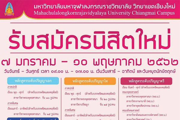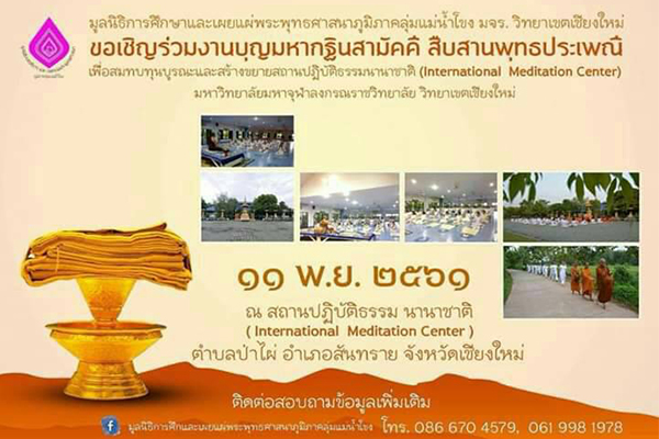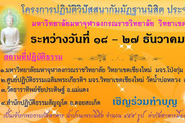 โครงการปฏิบัติวิปัสสนากัมมัฏฐานนิสิต ประจำปี ๒๕๖๑ มหาวิทยาลัยมหาจุฬาลงกรณราชวิทยาลัย วิทยาเขตเชียงใหม่ ระหว่างวันที่ ๑๘-๒๗ ธันวาคม ๒๕๖๑ อ่านต่อมูลนิธิการศึกษาและเผยแผ่พระพุทธศาสนาภูมิภาคลุ่มแม่น้ำโขง มจร. วิทยาเขตเชียงใหม่ ขอเชิญร่วมงานบุญมหากฐินสามัคคี สืบสานพุทธประเพณี เพื่อสมทบทุนบูรณะและสร้างขยายสถานปฏิบัติธรรมนานาชาติ มหาวิทยาลัยมหาจุฬา... อ่านต่อ |