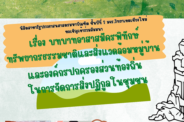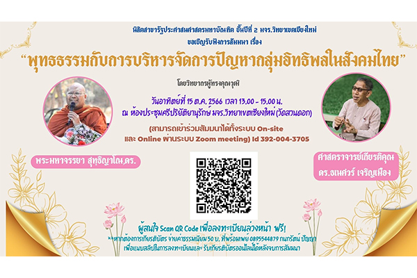 นิสิตสาขาวิชารัฐประศาสนศาสตรมหาบัณฑิต ชั้นปีที่ ๒ มจร วิทยาเขตเชียงใหม่ ขอเชิญรับฟังการสัมมนาเรื่อง "พุทธธรรมการบริหารจัดการปัญหากลุ่มอิทธิพลในสังคมไทย" ในวันอาทิตย์ที ๑๕ ตุลาคม ๒๕๖๖ ณ ห้องประชุมศรีปร...