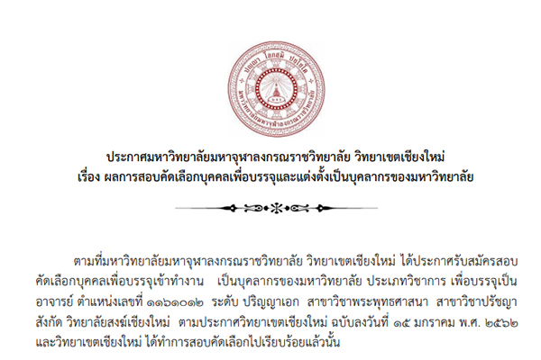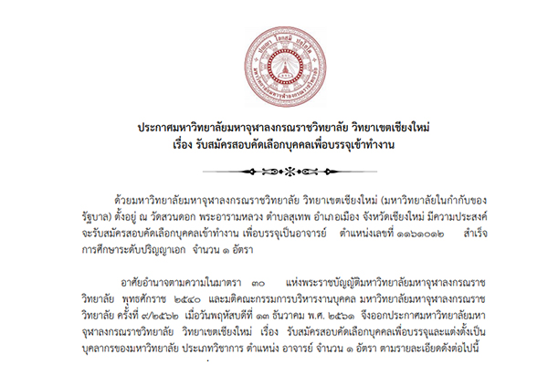 สังกัดส่วนงานวิทยาลัยสงฆ์เชียงใหม่ สำเร็จการศึกษาระดับปริญญาเอก จำนวน ๑ อัตรา อัตราเงินเดอืน ๓๑,๖๕...