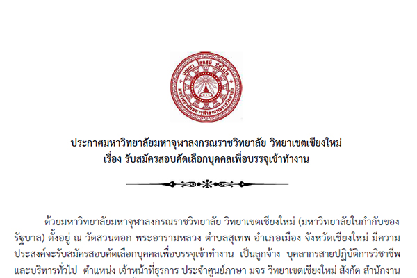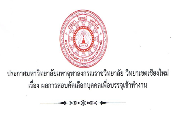 ประกาศผลการสอบคัดเลือกบุคคลเพื่อบรรจุเข้าทำงาน บุคลกรสายปฏิบัตการวิชาชีพและบริหารทั่วไป ลูกจ้าง ตำแหน่ง เจ้าหน้าที่ธุรการ เลขที่ ๒๒๑๙๐๐๒ ประจำศูนย์ภาษา มจร วิทยาเขตเชียงใหม่ สังกัด ส่วงนงานบริ...