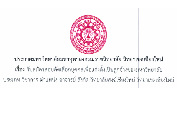 รับสมัครสอบคัดเลือกบุคคลเพื่อแต่งตั้งเป็นลูกจ้างของมหาวิทยาลัย ประเภท วิชาการ ตำแหน่ง อาจารย์ สังกัดงวิทยาลัยวงฆ์เชียงใหม่ วิทยาเขตเชียงใหม่
