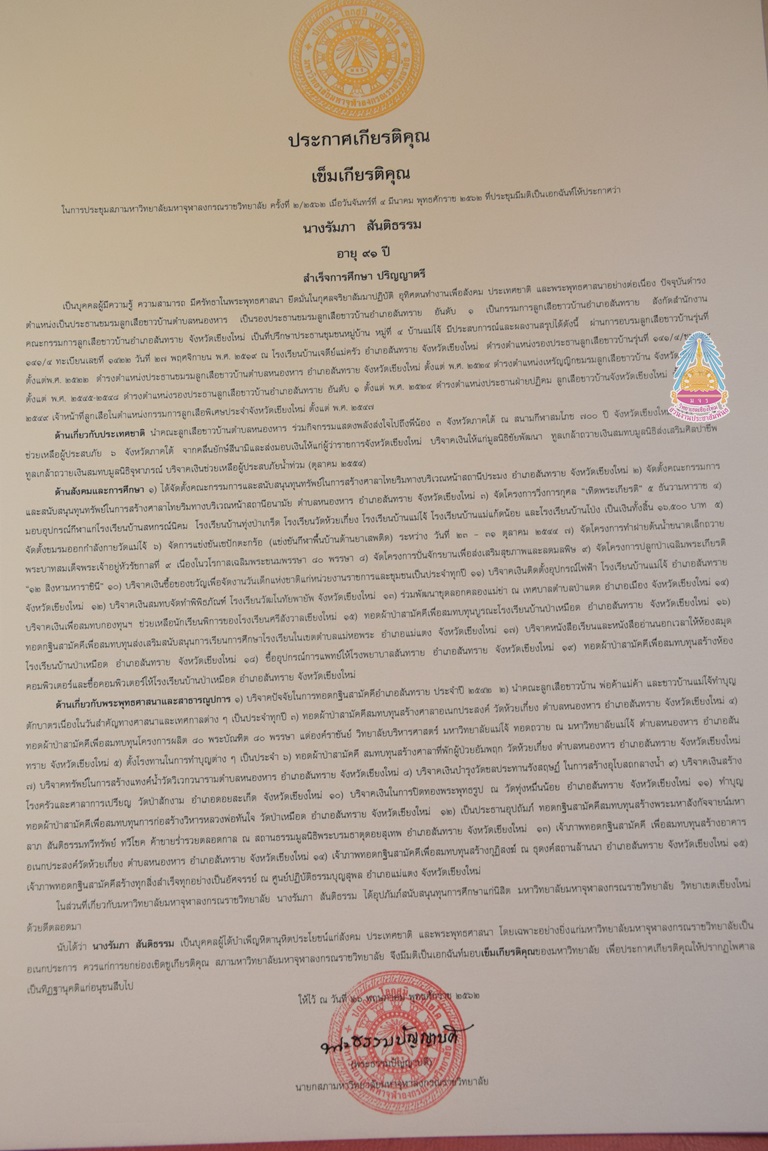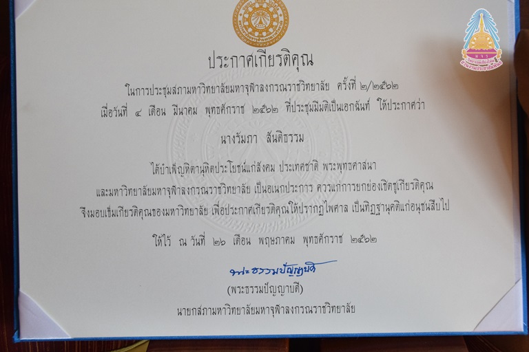 ผู้บริหาร คณาจารย์ เจ้าหน้าที่ มหาวิทยาลัยมหาจุฬาลงกรณราชวิทยาลัย วิทยาเขตเชียงใหม่ นำโดยพระวิมลมุนี รักษาการรองอธิการบดี เป็นประธานมอบเข็มเกียรติคุณให้นางรัมภา สันติธรรม ประจำปี ๒๕๖๒ เป็นบุคคลผู้มีความรู้ ความสามารถ ศรัทธาในพระพุทธศาสนา และเป็นผู้ที่อุปถัมภ์ สนับสนุนกิจกรรม มหาวิทยาลัยมาโดยตลอด ณ บ้านเลขที่ ๑๓๙ บ้านแม่โจ้ ตำบลหนองหาร อำเภอสันทราย จังหวัดเชียงใหม่ เมื่อ ๒๗ พฤษภาคม ๒๕๖๒