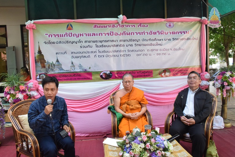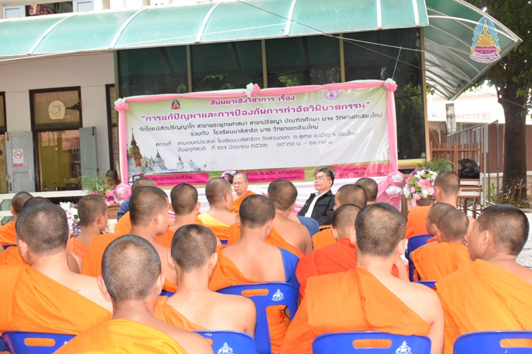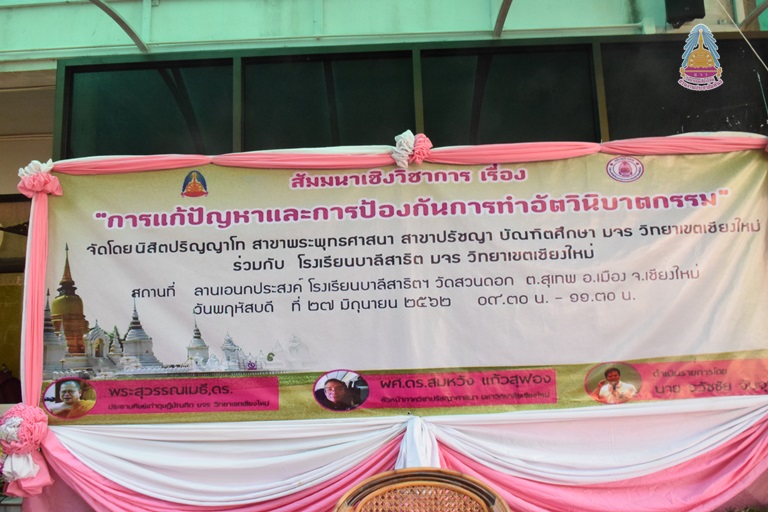 นิสิตปริญญาโท สาขาพระพุทธศาสนา สาชาปรัชญา บัณฑิตศึกษา มจร.วิทยาเขตเชียงใหม่ ร่วมกับ โรงเรียนบาลีสาธิตศึกษา มจร.วิทยาเขตเชียงใหม่ จัดสัมมนาเชิงวิชาการ เรื่อง “ การแก้ปัญหา และการป้องกันการทำอัตวินิบาตกรรม”โดยมีพระสุวรรณเมธี,ดร.เป็นวิทยากร พร้อมคณะ ณ ลานอเนกประสงค์โรงเรียนบาลีสาธิตศึกษา มจร.วิทยาเขตเชียงใหม่ อำเภอเมือองเชียงใหม่ จังหวัดเชียงใหม่ เมื่อ ๒๗ มิถุนายน ๒๕๖๒