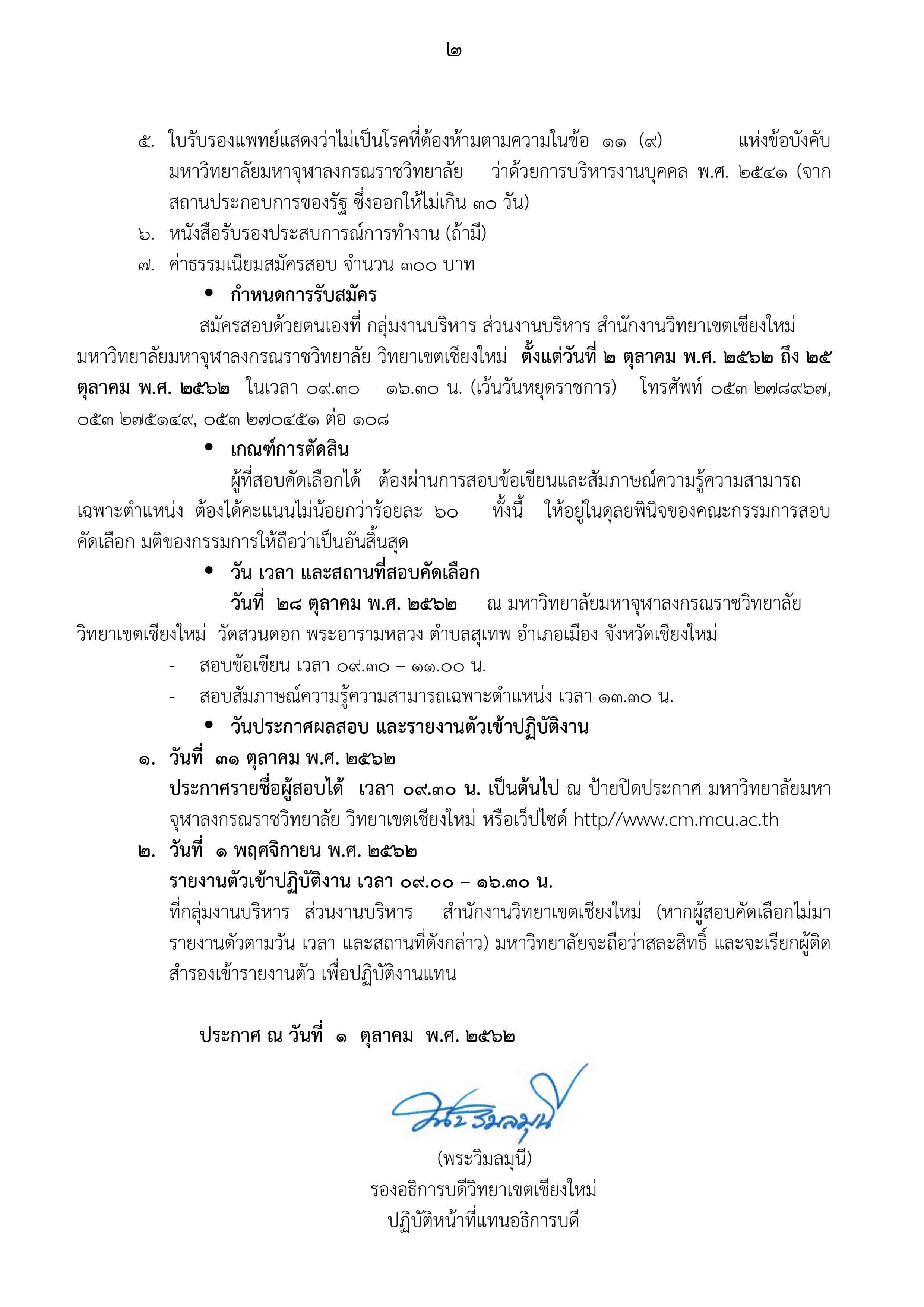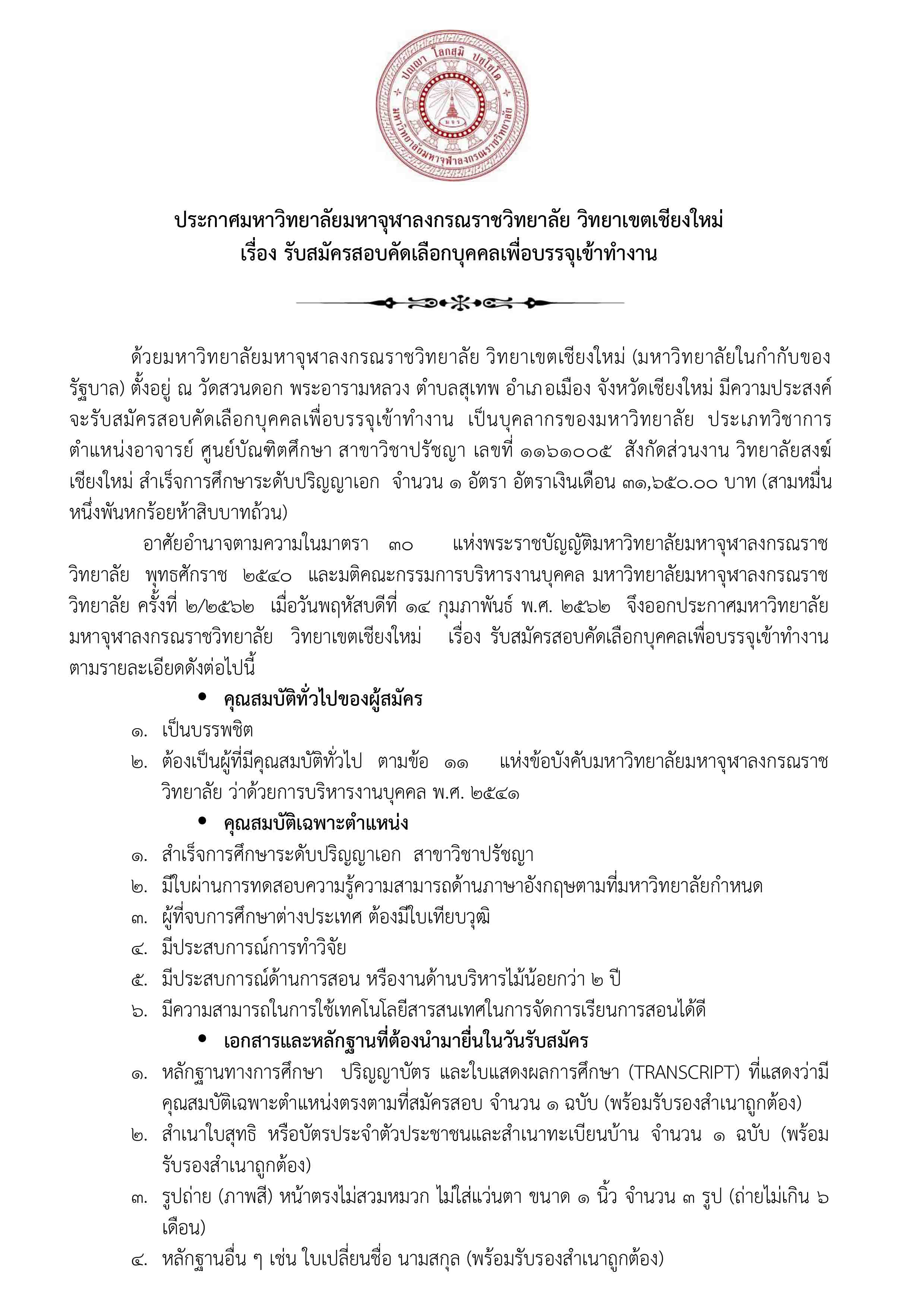 สังกัดส่วนงานวิทยาลัยสงฆ์เชียงใหม่ สำเร็จการศึกษาระดับปริญญาเอก จำนวน ๑ อัตรา อัตราเงินเดอืน ๓๑,๖๕๐ บาทถ้วน