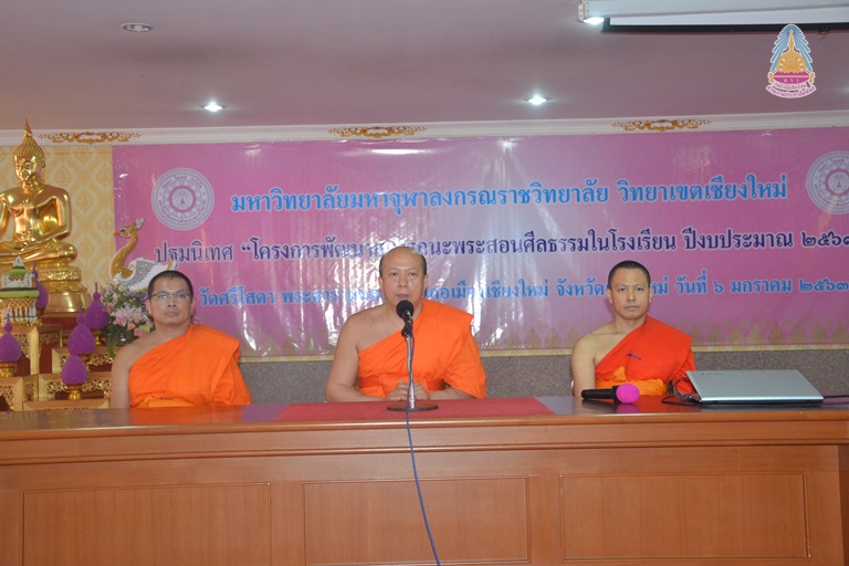 พระวิมลมุนี รองอธิการบดี มหาวิทยาลัยมหาจุฬาลงกรณราชวิทยาลัย วิทยาเขตเชียงใหม่ เป็นประธานพิธีเปิดปฐมนิเทศ “โครงการพัฒนาสมรรถนะพระสอนศีลธรรมในโรงเรียน ปีงบประมาณ ๒๕๖๓” โดยมีพระครูสิริบรมธาตุพิทักษ์,ผศ.ดร.รักษาการผู้อำนวยการวิชาการกล่าวรายงาน มีผู้บริหาร คณาจารย์ เจ้าหน้าที่ และผู้ที่เกี่ยวข้องร่วมพิธี ณ วัดศรีโสดา พระอารามหลวง อำเภอเมืองเชียงใหม่ จังหวัดเชียงใหม่ เมื่อ ๖ มกราคม ๒๕๖๓...ณัฐพล ภาพ/ศรีมูล บรรยาย
