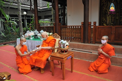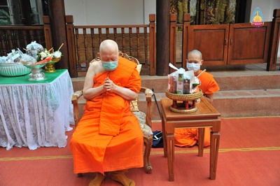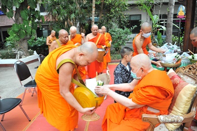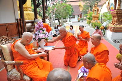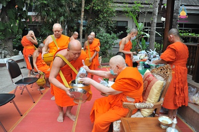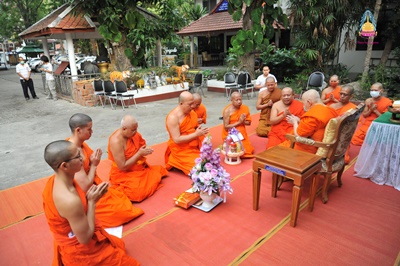 พระเทพโกศล (สังวาลย์ พฺรหฺมวณฺโณ) อายุ ๘๕ พรรษา ๖๕ (ป.ธ. ๖ น.ธ. เอก M.A) ที่ปรึกษาเจ้าคณะภาค ๗ เจ้าอาวาสวัดศรีโสดา พระอารามหลวง ประธานโครงการพระธรรมจาริก ส่วนภูมิภาค อดีตรองอธิการบดี มหาวิทยาลัยมหาจุฬาลงกรณราชวิทยาลัย วิทยาเขตเชียงใหม่ รูปที่ ๒ (๒๕๔๑-๒๕๔๗) ตักบาตรพระสงฆ์ จำนวน ๙ รูป เนื่องในโอกาสครบรอบคล้ายวันเกิดเจริญอายุวัฒนมงคล ท่ามกลางคณะพระภิกษ สามเณร พุทธศาสนิกชน ร่วมพิธี ณ วัดศรีโสดา พระอารามหลวง ตำบลสุเทพ อำเภอเมืองเชียงใหม่ จังหวัดเชียงใหม่ เมื่อ ๑๑ เมษายน ๒๕๖๓