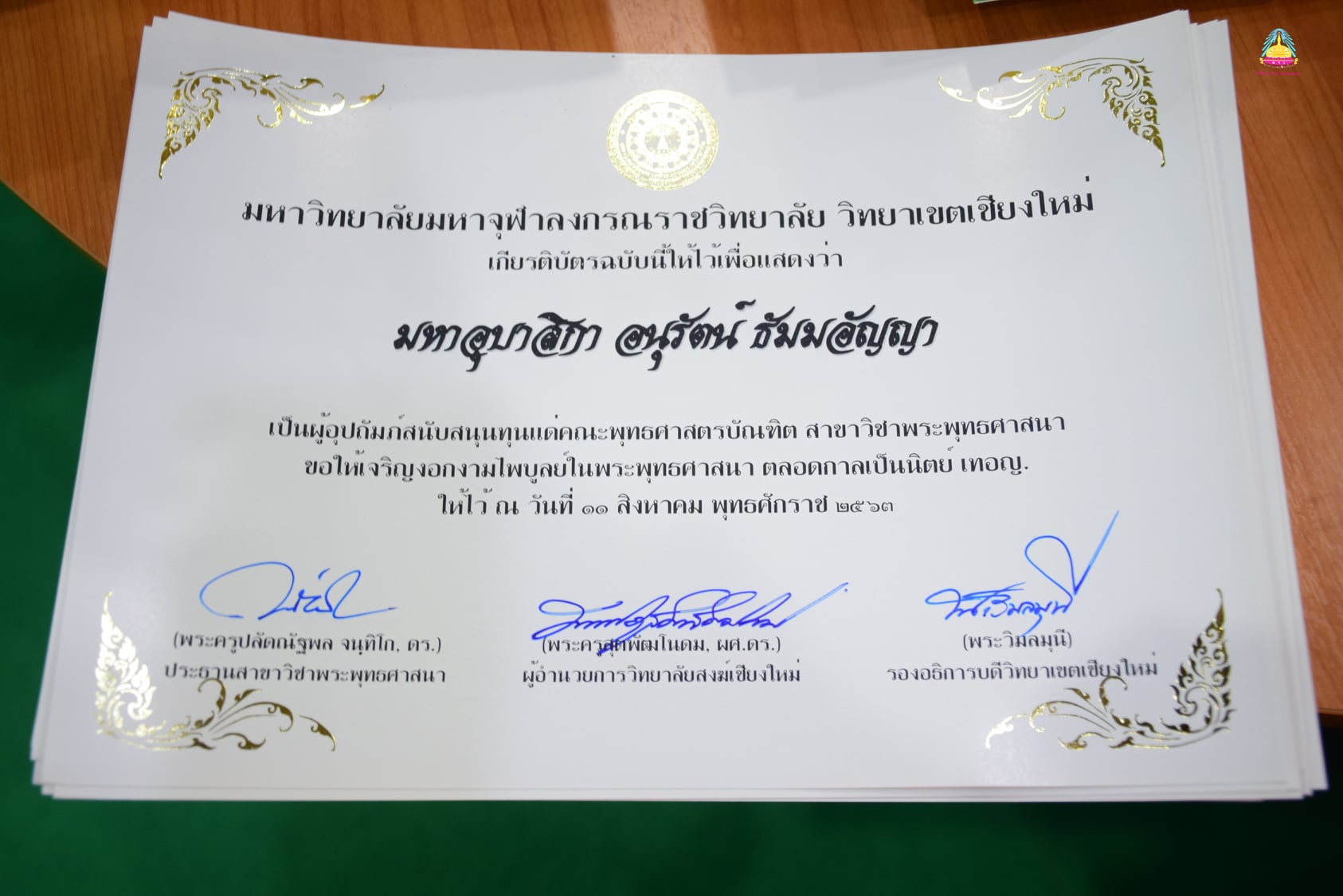 มหาอุบาสิกาอนุรัตน์ ธัมมอัญญา พร้อมกัลยาณมิตร ศิษย์เก่าโรงเรียนส่วนบุญโญปถัมภ์ รุ่น ๑๗ ถวายทุนการศึกษาสำหรับพระนิสิตสาขาพระพุทธศาสนา มหาวิทยาลัยมหาจุฬาลงกรณราชวิทยาลัย วิทยาเขตเชียงใหม่ จำนวน ๑๐๐,๐๐๐ บาท และทุนพัฒนาอาจารย์และนิสิตสาขาพระพุทธศาสนา จำนวน ๑๐๐,๐๐๐ บาท โดยมีพระวิมลมุนี รองอธิการบดี มหาวิทยาลัยมหาจุฬาลงกรณราชวิทยาลัย วิทยาเขตเชียงใหม่ เป็นประธานรับ พร้อมด้วยคณะผู้บริหาร คณาจารย์ เจ้าหน้าที่ นิสิต ให้การต้อนรับ ณ ห้องประชุมศรีปริยัตยานุรักษ์ มจร.วิทยาเขตเชียงใหม่ อำเภอเมืองเชียงใหม่ จังหวัดเชียงใหม่ เมื่อ ๑๑ สิงหาคม ๒๕๖๓
