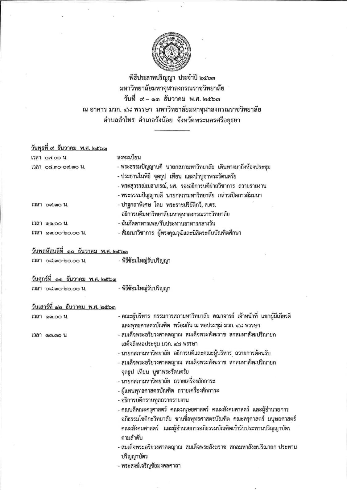 กำหนดการพิธีประสาทปริญญา ประจำปี ๒๕๖๓