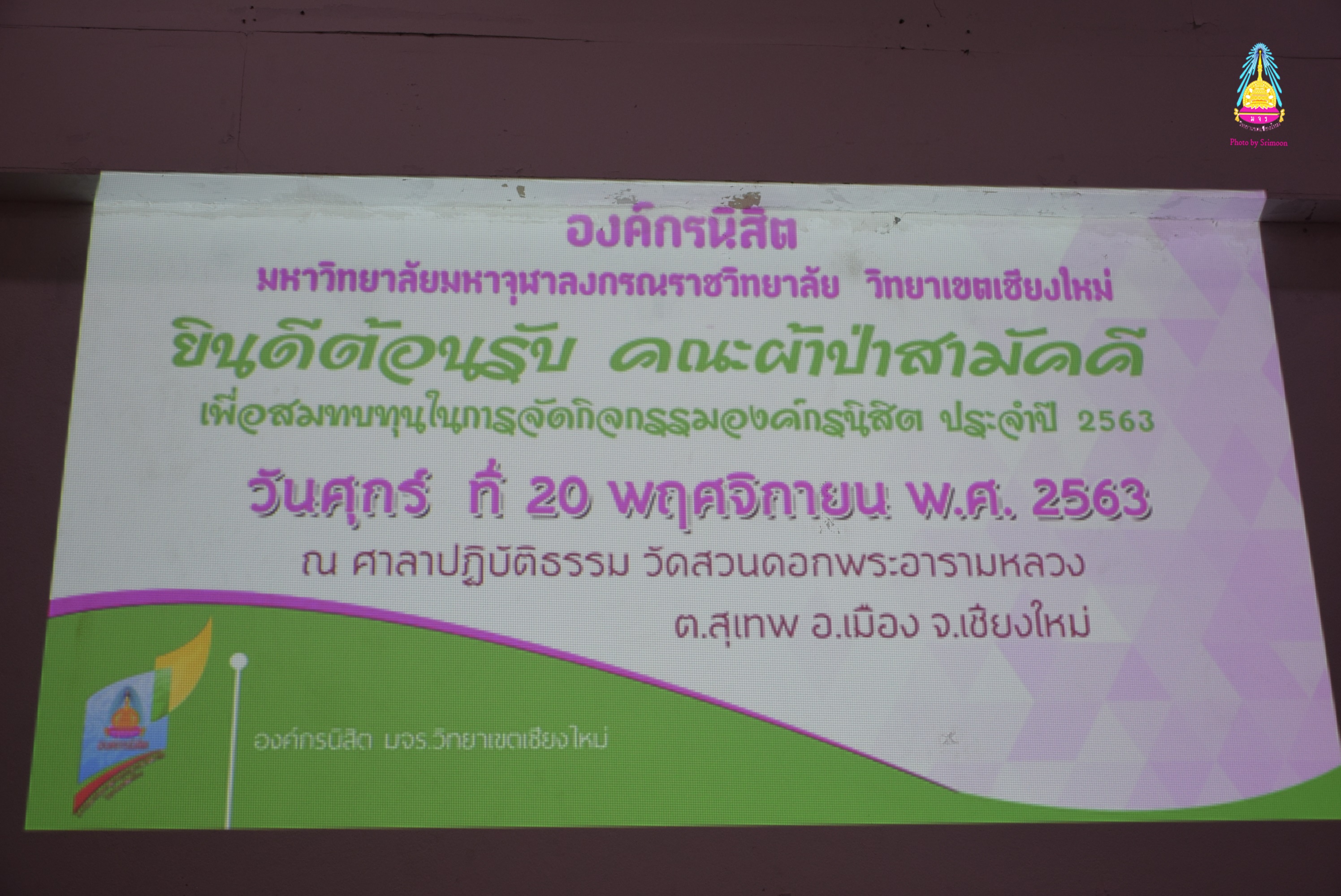 องค์กรนิสิต มหาวิทยาลัยมหาจุฬาลงกรณราชวิทยาลัย วิทยาเขตเชียงใหม่ ประกอบพิธีทำบุญทอดผ้าป่าสามัคคี เพื่อสมทบทุนในการจัดกิจกรรมองค์กรนิสิต โดยมีพระครูสุตพัฒโนดม,ผศ.ดร. ผู้อำนวยการวิทยาลัยสงฆ์เชียงใหม่ เป็นประธาน มีผู้บริหาร คณาจารย์ เจ้าหน้าที่ นิสิตทุกคณะ ร่วมพิธี ณ ศาลาปฏิบัติธรรม วัดสวนดอก พระอารามหลวง อำเภอเมืองเชียงใหม่ จังหวัดเชียงใหม่ เมื่อ ๒๐ พฤศจิกายน ๒๕๖๓