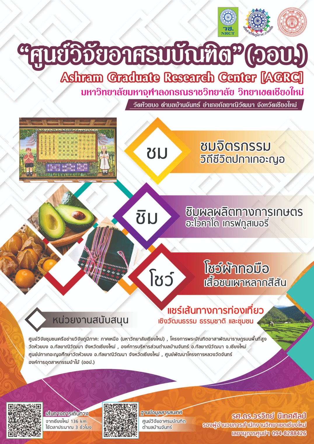 ศูนย์วิจัยชุมชน ในชื่อว่า “ศูนย์วิจัยอาศรมบัณฑิต” อักษรย่อ วอบ ในชื่อภาษาอังกฤษว่า Ashram Graduate Research Center อักษรย่อ AGRC ภายใต้โครงการยกระดับเศรษฐกิจและสังคมรายตำบลแบบบูรณาการ (๑ ตำบล ๑ มหาวิทยาลัย) มีเป้าหมายในการก่อให้เกิดการสร้างองค์ความรู้และบทเรียนการวิจัย โดยการส่งเสริมและพัฒนาเทคโนโลยี/ภูมิปัญญาที่เหมาะสมกับชาวบ้านที่เป็นเกษตรกร วิสาหกิจชุมชน ผู้ประกอบการขนาดเล็ก (SMEs) เพื่อสร้างผลลัพธ์ทางเศรษฐกิจ สังคม และสิ่งแวดล้อมต่อสังคม โดยมีกลไกในการบริหารจัดการที่มีประสิทธิภาพ เกิดประสิทธิผลอย่างต่อเนื่องและยั่งยืน ในการเสริมพลังศูนย์วิจัยชุมชน กิจกรรมบูรณาการการวางแผนกับโครงการภาคี (Strategic partners) การพัฒนาศักยภาพกรรมการ การระดมทุนวิจัยจากแหล่งทุนวิจัย การเผยแพร่และประชาสัมพันธ์องค์ความรู้และนวัตกรรมสู่กลุ่มเป้าหมาย และการนำผลการวิจัยไปใช้ประโยชน์ในการรับใช้สังคม ร่วมกับนักวิชาการจากสถาบันการศึกษา องค์กรบริหารส่วนท้องถิ่น หน่วยงานภาครัฐและเอกชน