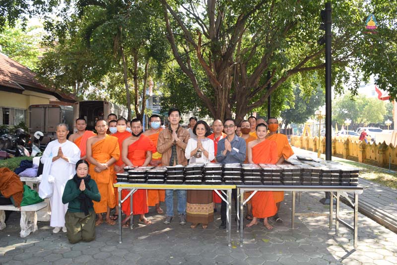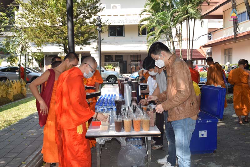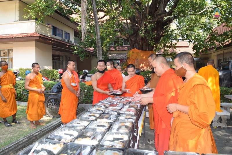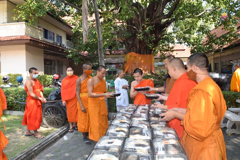 พระบุญสม บุญญวัฑฒโน นิสิตสาขาพระพุทธศาสนา ชั้นปีที่ ๓ มหาวิทยาลัยมหาจุฬาลงกรณราชวิทยาลัย วิทยาเขตเชียงใหม่ ทำบุญเนื่องในโอกาสครบรอบคล้ายวันเกิด คุณแม่อนุรัตน์ ธัมมอัญญา พร้อมคณะ ถวายภัตตาหารเพลแด่พระนิสิต นิสิต จำนวน ๓๐๐ ชุด พร้อมชา กาแฟ น้ำผลไม้ ณ บริเวณข้างพระอุโบสถพระเจ้าเก้าตื้อ วัดสวนดอก พระอารามหลวง อำเภอเมือง จังหวัดเชียงใหม่ เมื่อ ๑๖ กุมภาพันธ์ ๒๕๖๔