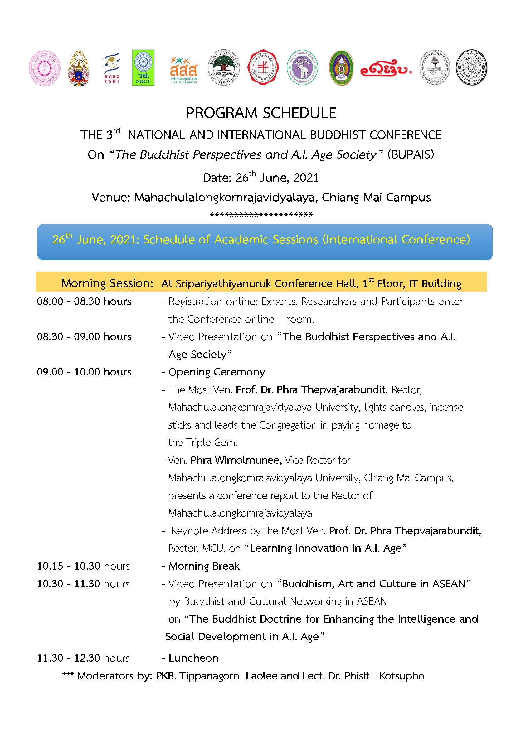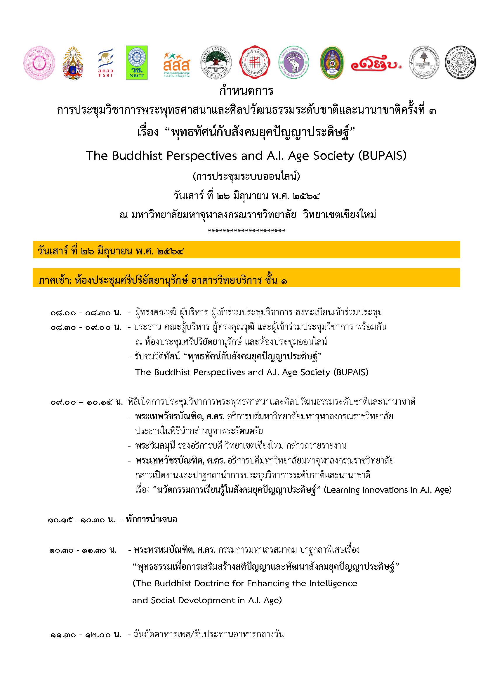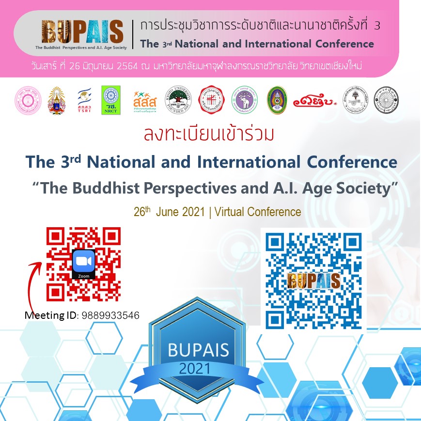 The 3rd National and International Conference (MCU. CM. 2021) เรื่อง“พุทธทัศน์กับสังคมยุคปัญญาประดิษฐ์” The Buddhist Perspectives and A.I. Age Society (BUPAIS) วันเสาร์ ที่ 26 มิถุนายน 2564 โดยใช้ระบบการประชุมออนไลน์ ตั้งแต่เวลา 08.30-16.30 น. เพื่อเผยแพร่ผลงานวิชาการด้านพระพุทธศาสนาศิลปวัฒนธรรมของบุคลากรมหาวิทยาลัยมหาจุฬาลงกรณราชวิทยาลัยในระดับชาติและนานาชาติ และการสร้างเครือข่ายความร่วมมือในการศึกษาและแลกเปลี่ยนความรู้กับองค์กรในระดับชาติและนานาชาติ