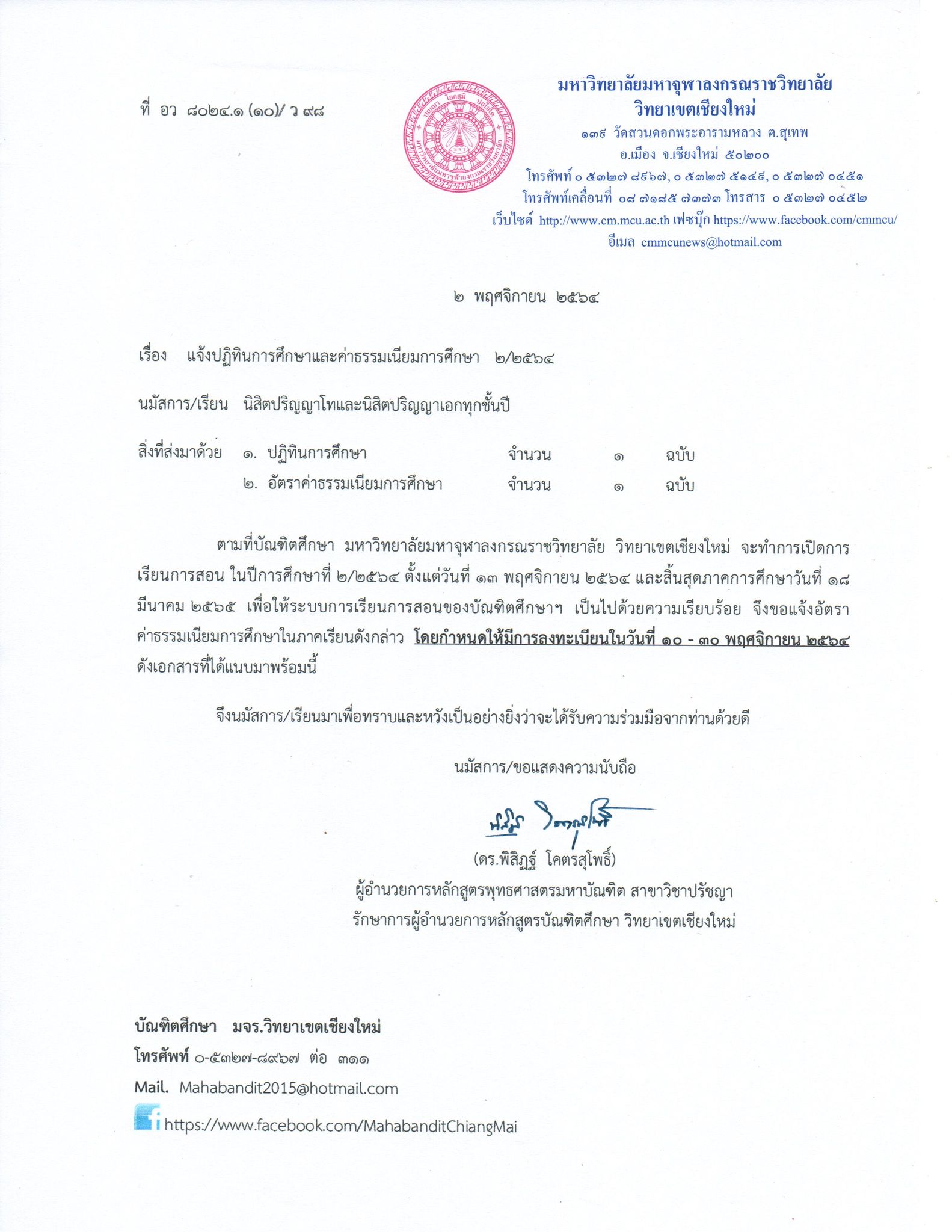 ค่าธรรมเนียมและปฏิทินการศึกษาระดับบัณฑิตศึกษา 2/2564