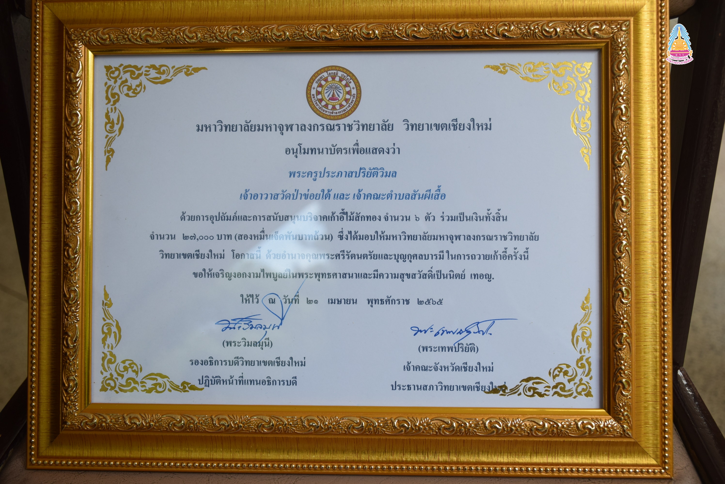 พระครูประภาสปริยัติวิมล (อรุณ อคฺคจิตฺโตป.ธ.๔) เจ้าคณะตำบลสันผีเสื้อ เจ้าอาวาสวัดป่าข่อยใต้ อำเภอเมืองเชียงใหม่ กรรมการผู้ทรงคุณวุฒิ ถวายเก้าอี้ไม้สักทอง จำนวน ๖ ตัว มูลค่า ๒๗,๐๐๐ บาท (สองหมื่นเจ็ดพันบาทถ้วน) ให้แก่มหาวิทยาลัยมหาจุฬาลงกรณราชวิทยาลัย วิทยาเขตเชียงใหม่ โดยมีพระวิมลมุนี รองอธิการบดี เป็นประธานรับถวาย มีผู้บริหาร คณาจารย์ บุคลากร ร่วมอนุโมทนา ณ หน้าสำนักงานวิทยาเขตเชียงใหม่ อำเภอเมืองเชียงใหม่ เมื่อ ๖ พฤษภาคม ๒๕๖๕