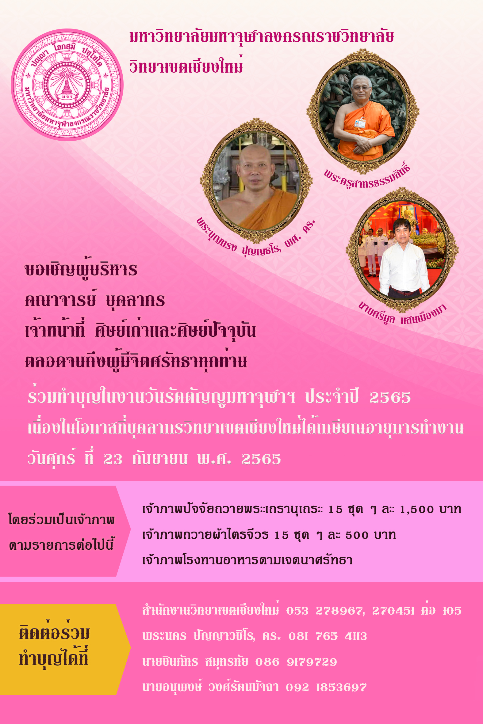 ติดต่อร่วมทำบุญได้ที่ สำนักงานวิทยาเขตเชียงใหม่ ๐๕๓ ๒๗๘๙๖๗, ๒๗๐๔๕๑ ต่อ ๑๐๕
