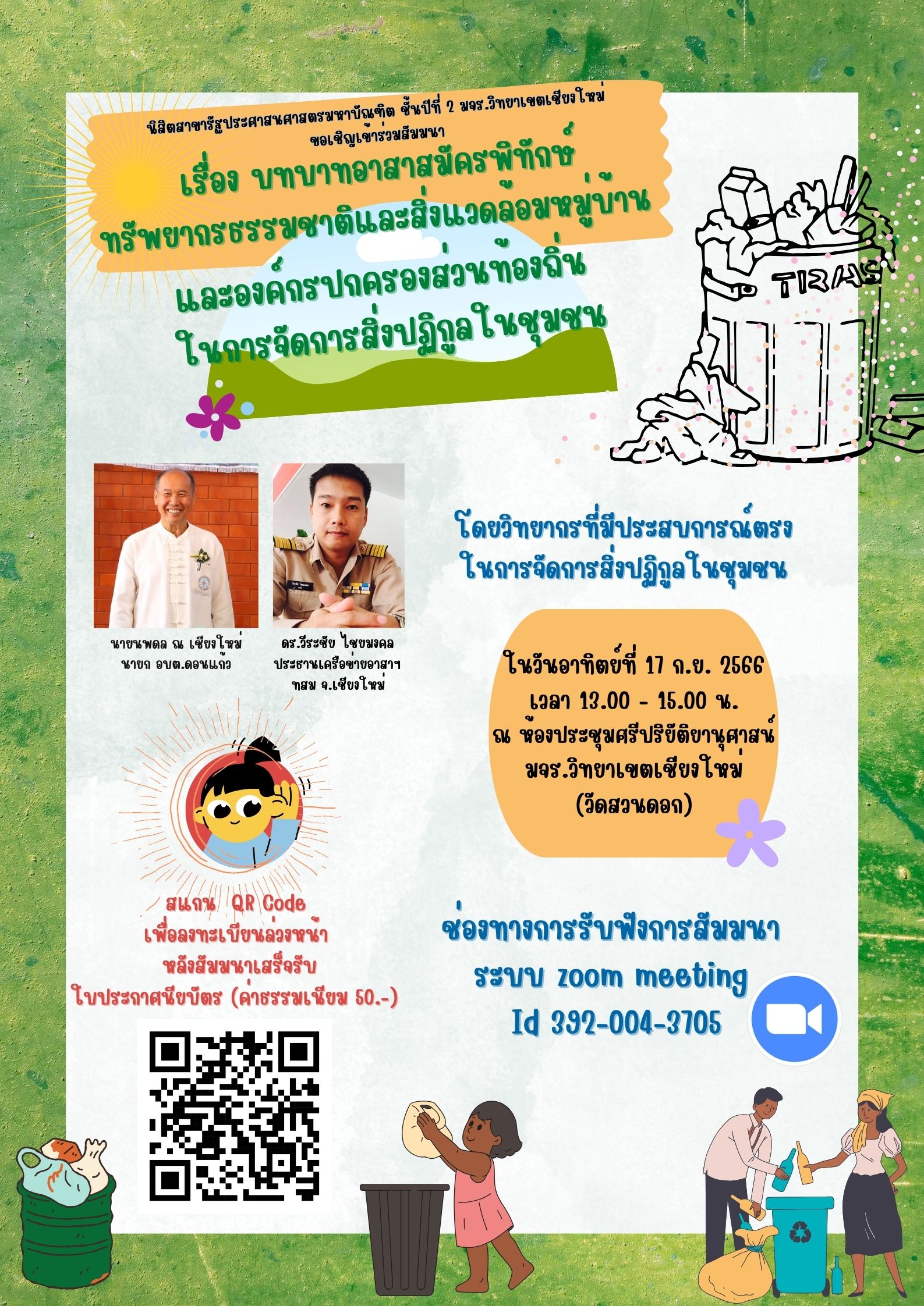 ขอเรียนเชิญ นิสิต นักศึกษา ประชาชน รวมถึงผู้ที่สนใจเข้าร่วมงาน สัมมนาเรือง "บทบาทอาสาสมัครพิทักษ์ทรัพยากรธรรมชาติและสิ่งแวดล้อมหมู่บ้าน และองค์กรปกครองส่วนท้องถิ่นในการจัดการสิ่งปฏิกูลในชมุชน" ในวันอาทิตย์ ที่ 17 กันยายน 2566 เวลา 1300 - 16.00 ผ่านระบบ Zoom Meeting ID : 3920043706 หรือจะมารระบบ Onsite ได้ที่ ห้องประชุมศรีปริยัติยานุศาสน์ มจร วิทยาเขตเชียงใหม่