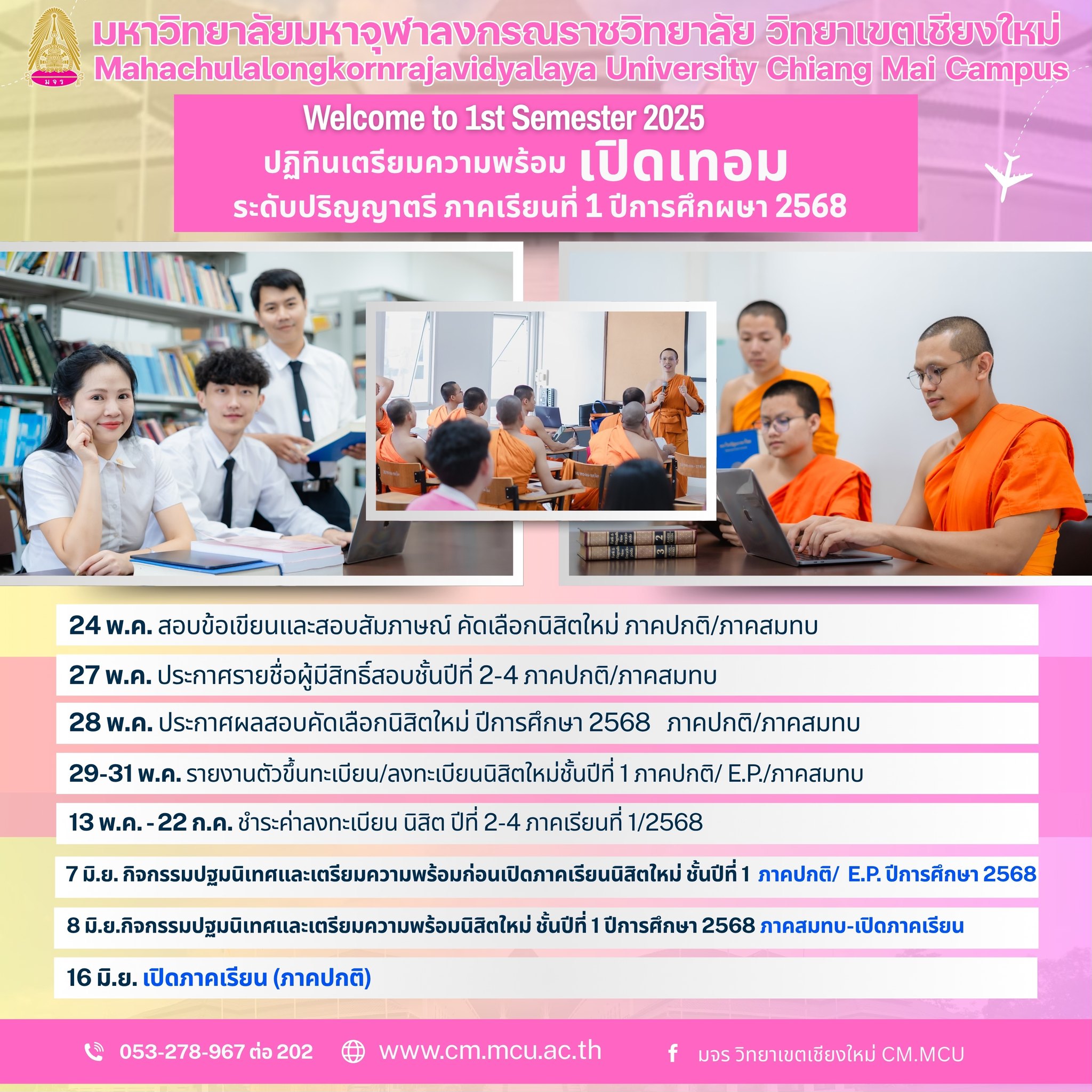 -ภาคปกติวันที่ 7 มิ.ย. ที่วิหารหลวง ลงทะเบียน 08.00 น./ภาคบ่ายกิจกรรมเตรียมความพร้อมก่อนเปิดเรียนที่อาคาร มจร.